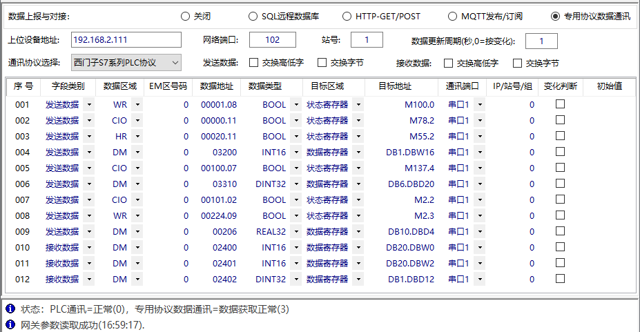 端口參數設置完成后下載重啟才會生效,另外串口連接PLC還可以用‘單站協議匹配’功能自動搜索出PLC,網絡檢查可以用‘執行PING’。PLC連接和網絡確認后就可配置數據表了,通過‘功能’->‘數據上報與平臺對接’進入數據上報與平臺對接頁面,選擇‘專用協議數據通訊’的數據配置表,下圖是配置的部分參數,通過底部的狀態消息可以看出數據交互是正常的。