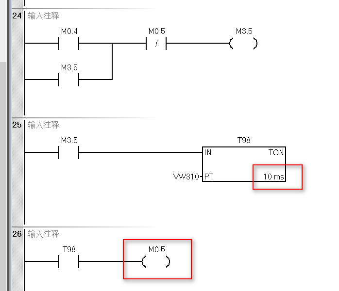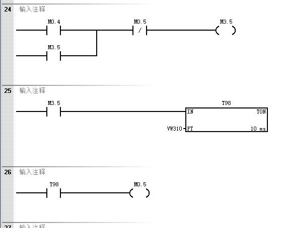 個人看法是,程序受掃描順序和掃描周期的影響,應該把程序的上下順序調換一下,1,從一樓所示的程序網絡24,25,26,3個網絡的程序順序調換一下,按順序25,26,24的順序調整下,因為如果整個程序的掃描周期大于10MS的話,那個延時可能斷不開那個M3.5,,,,2,另外那個回原點程序網絡的8應該在26后面即M0.5ON的程 序后面,
