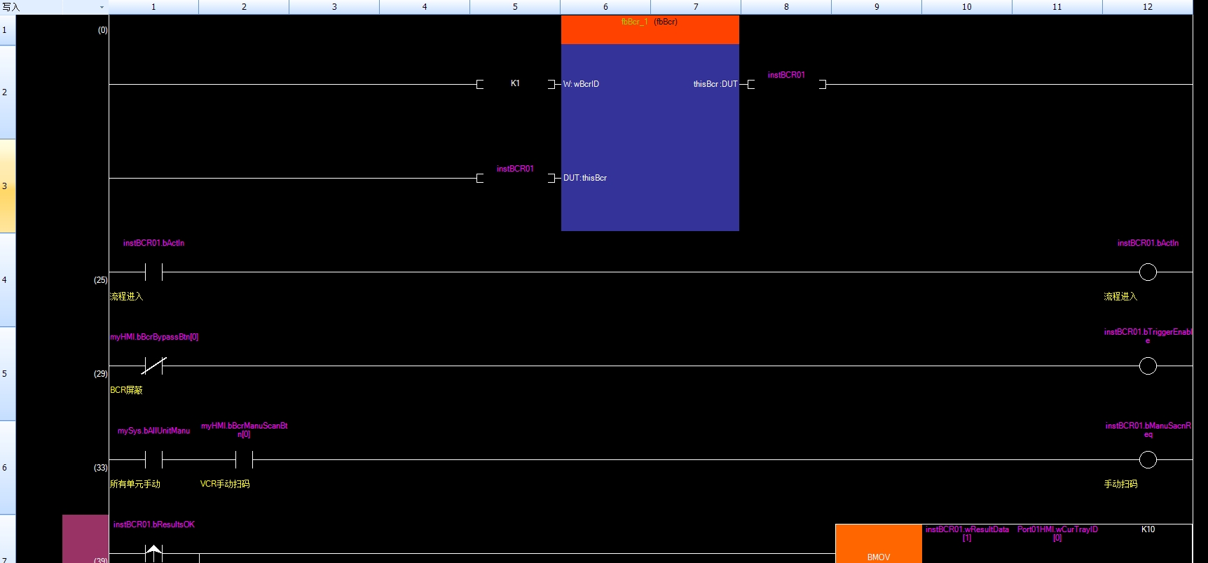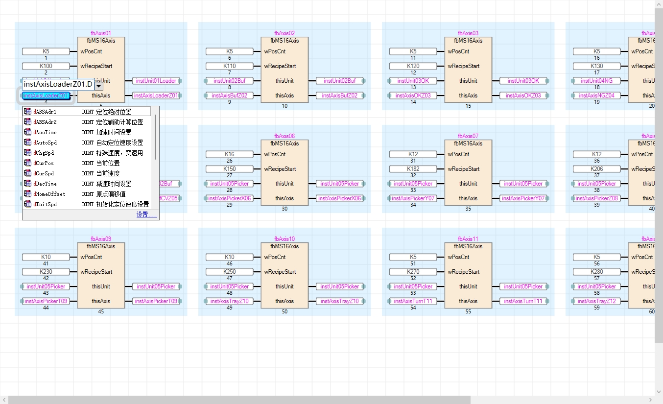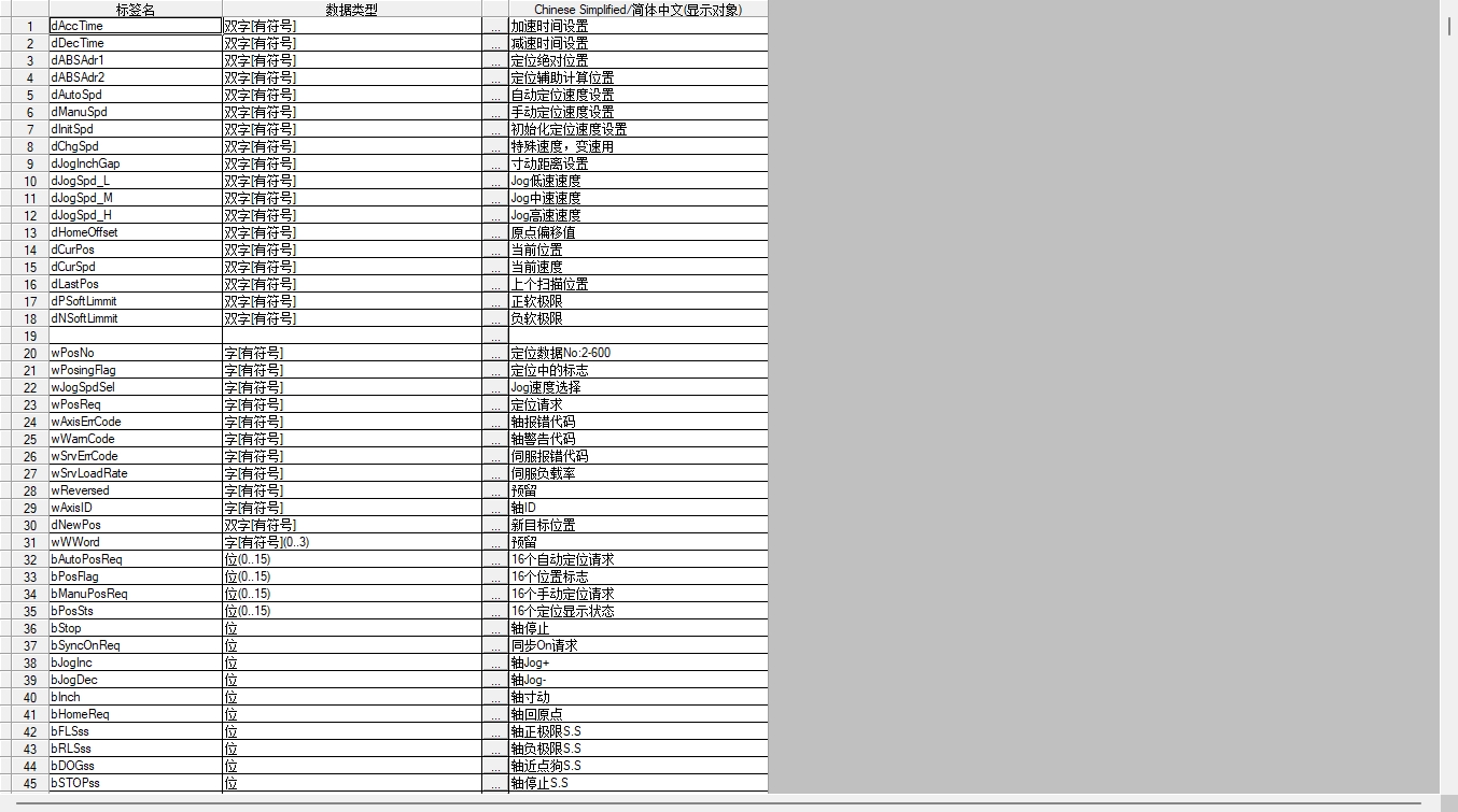 有一個比較明顯的就是軸FB的input和OutPut太多了,不夠直觀,建議用FB,傳入軸結構體進行處理,統一放到fb結構化編程里比較直觀,流程什么的還是用梯形圖比較方便。另外,標簽命名可以優化下,第一個前綴最好標明數據類型,你在找標簽時,輸入實例+.+數據類型如(b,w,d),再細分找相應的數據。結構體用st前綴,FB用FB前綴