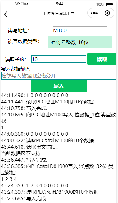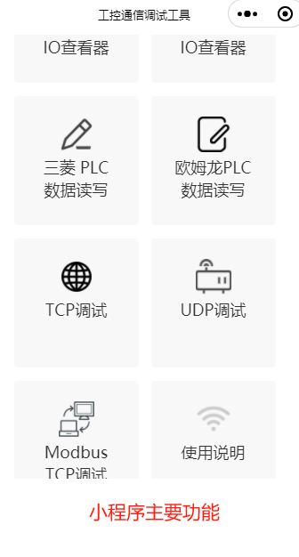 手機時代到了,一直用電腦調試有時候不方便,簡單的東西確認可以用手機測試不必打開電腦。本小程序支持1.三菱PLC IO查看  數據讀寫。2.歐姆龍PLC IO查看  數據讀寫。3.Modbus TCP調試 數據讀寫。4. TCP UDP調試。