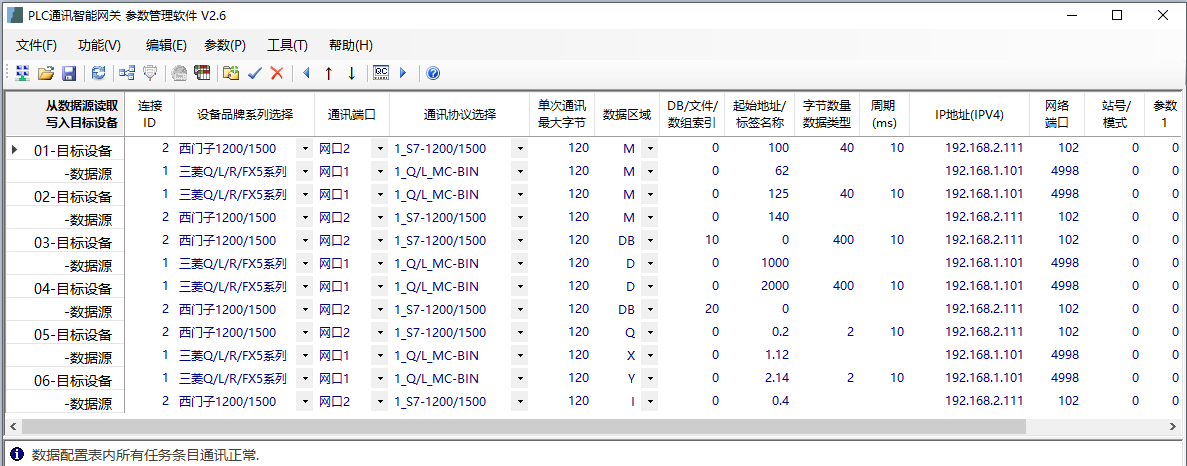 IGT-DSER是從數據源讀取數據后寫入到目標設備, 通過改變數據源和目標設備對應不同的行實現PLC之間雙向通訊。通過參數配置軟件(在附件中)根據PLC通訊地址,寄存器數量等參照案例配置好相關參數后下載重啟(參數->參數寫入到網關)、(工具->重啟網關);通過網關的參數配置軟件讀取網關參數(參數->從網關讀取參數)后,看軟件上顯示的狀態消息,根據狀態消息調試,正常是如下圖的狀態消息,(工具->網關數據監控)可查看數據源的數據。