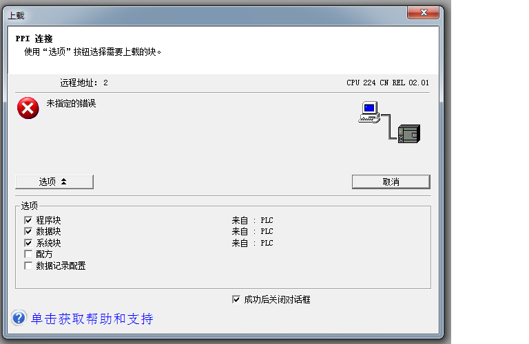 幾臺設備用的是西門子S7-200,CPU224CN,現在有一臺出現一個繼電器觸點粘連的現象。想重新編程換個通道。但是電腦聯機上載程序進度完成后出現“未指定的錯誤”的提示。 單獨上載系統塊和數據塊都是正常的。不知道是什么原因,有知道的嗎? 試了一下其他正常工作的PLC上載程序也是這個現象。 |
