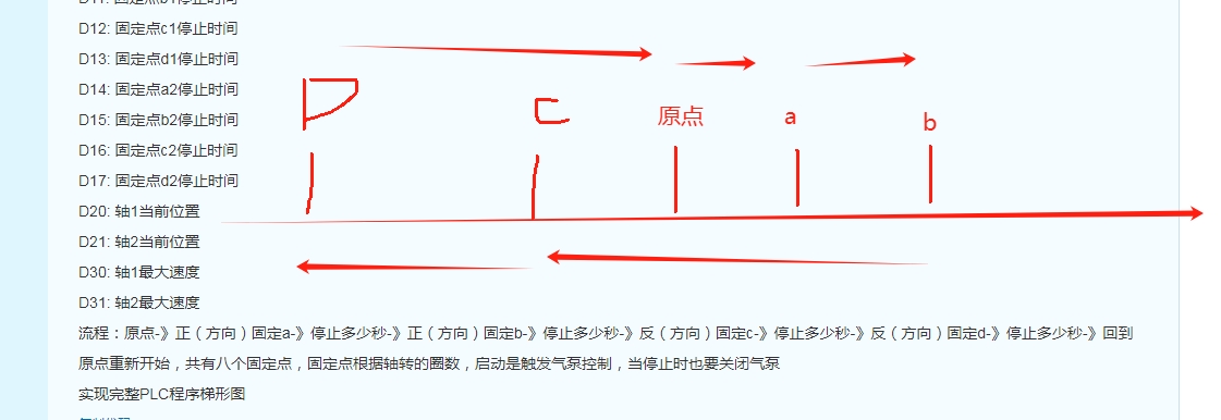 引用引用樓主wangfuchi于2025-05-09 17:55發表的 各位大佬,幫幫忙看看寫的梯形圖對嗎?FX3g 兩個伺服電機控制兩個軸運動, :三菱plc fx3g含以下功能 兩個伺服電機控制兩個軸:兩個獨立控制軸,每個軸有原點光電傳感器固定轉速和固定距離運動四個固定位置點分別時電機(圈數a=100,圈數b=300,圈數c=200 ,圈數d=50)可調停止時間.......