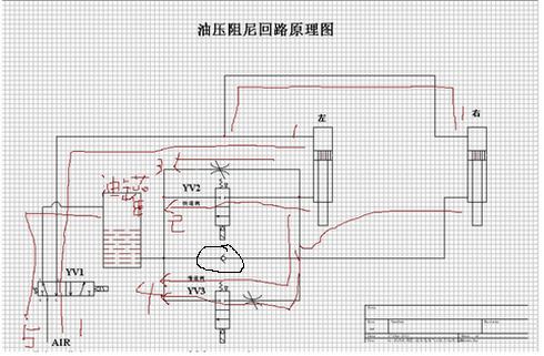 我把你的圖進行了編號,來說明我對圖紙的理解。壓縮空氣通過YV1進入到氣缸,如果(一)氣缸回路是1→左右氣缸→2(YV2)→油罐→YV1→5;氣缸速度是快速。(二)氣缸回路是1→左右氣缸→3(過溢流閥)→油罐→YV1→5;氣缸速度是中速。(三)氣缸回路是1→左右氣缸→4(YV3和溢流閥)→油罐→YV1→5;氣缸速度是慢速。圖中的黑線圈是什么作用,請指教