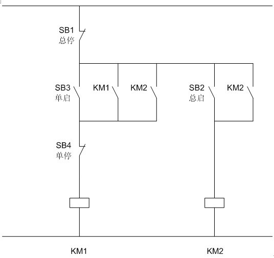 引用引用第57樓北人股份于2012-05-29 10:33發(fā)表的 :1、先后啟停 按下SB3,KM1啟動,按下SB2, KM2啟動。按下SB4,KM1停止,按下SB1,KM2停止。2、同時啟停 按下SB2,KM1,KM2同時啟動。按下SB1同時停止。