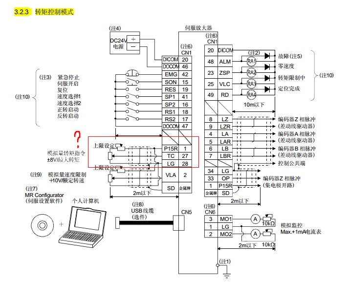 就是三菱的MR-J2S-A放大器中引腳TC(模擬量轉矩指令)的應用,不太明白?“模擬量轉矩指令為正”是怎么控制的?是PLC程序中控制的嗎?還是外加電路(滑變電阻器)控制呢???請賜教。。。