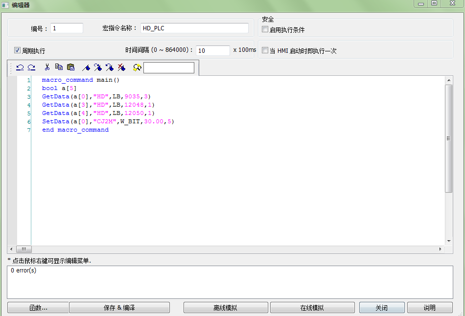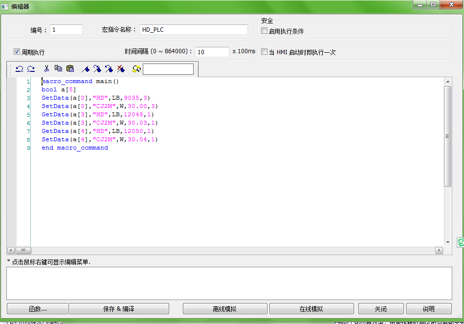 有一個項目用到威綸的cMT-HD與歐姆龍的CJ2M PLC通過交換機以太網通信,由于將設備的檢測數據保存,在cMT-HD的程序中使用資料取樣獲取PLC的檢測結果數據并保存到U盤內,想在PLC內做一個U盤是否有插入的檢測、報警,做了這個宏程序,每1S執行一次宏程序,但下載后PLC側只有W30.00間隔通斷,其它W30.01~W30.04都不會通斷,在將U盤從cMT-HD拔下后W30.00也不會通斷了,在觸摸屏上做了個LB12048(系統寄存器:U盤插入狀態偵測)的位指示燈進行監控,確認LB12048在U盤插入時ON,拔下后OFF;按宏程序要求,如果LB12048狀態ON時應該是PLC的W30.03為ON,但實際卻是W30.00會間隔通斷,在觸摸屏上修改下程序讀取其它的LB狀態輸出到PLC的W寄存器,用離線模擬測試也沒有輸出到PLC的狀態位,但PLC選擇三菱寄存器選擇M時,離線模擬M位的狀態是會隨著觸摸屏側LB的狀態而改造,不知為什么歐姆龍的就不行?問過威綸的技術支持說就是這樣用的,特來論壇求教!望了解的朋友不吝指教,謝謝!