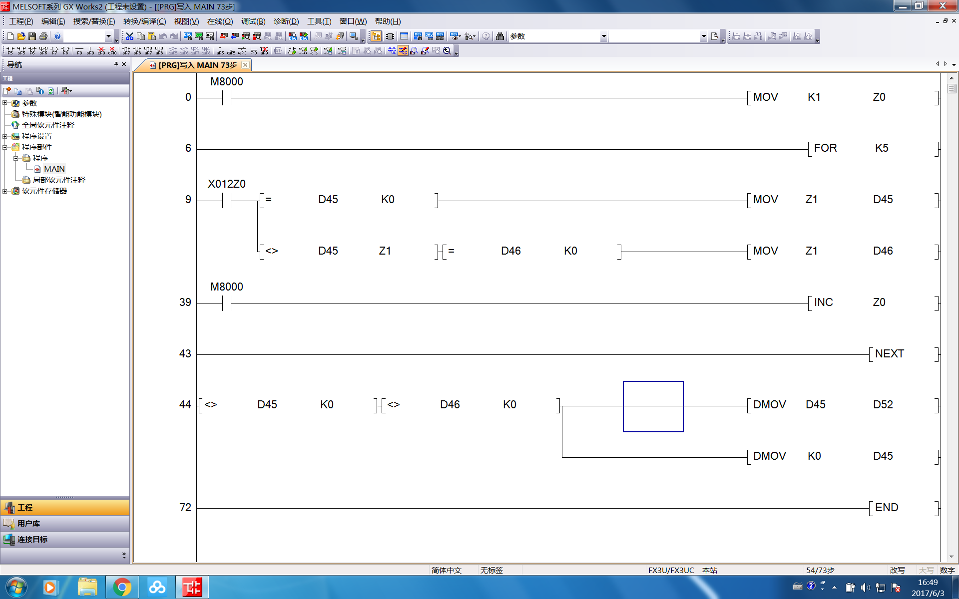 X13-X17 5個輸入點 對應數字1-5,當x13-x17生效時會將對應的數字傳送至D45 D46兩個寄存器(即5個輸入點搶位并把對應的數字存在D45 D46),D45 D46有數值就傳送到D47 D48由小到大排位,排位完成傳送到D52 D53并將D47 D48清零(X13-X17會不定時有輸入)