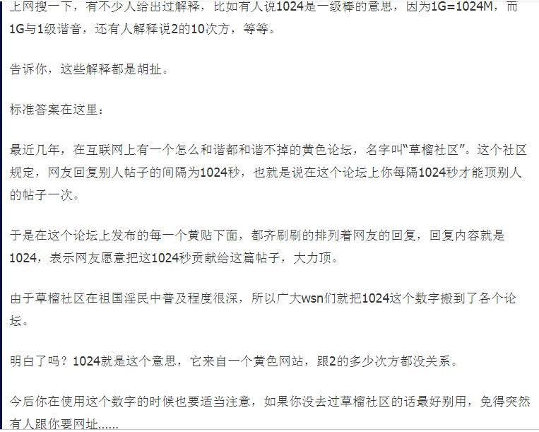 準確地來說此回復來自于一個名為“CL社區(qū)”的綜合性論壇,因此論壇分為等級制度,在特定等級以下的會員均每隔1024秒可以回復一次(解讀:除新手上路外,俠客以上(包括俠客)不能直接回復1024。也就說,新手上路在發(fā)完一貼后,再在發(fā)下一貼的時候要等上1024秒后才可以繼續(xù)發(fā)貼。(也可以說1024秒除以60秒每分鐘等于17分鐘)解讀為17分鐘后方可發(fā)貼。 論壇這么做的目的,是防止新人在不了解版規(guī)的情況下,惡意灌水、發(fā)廣告、等等。晉級后便不受1024限制)。在時間的洗禮中,1024一詞已經成為一名CL人必經的階段,每隔“1024“秒回復一次的發(fā)帖資格成為一種可貴的機會。因此,主題能夠得到的限制級1024用戶的回復越多,證明了用戶對主題帖的肯定。 從而1024延伸到了對主題的頂帖。和“UP”“頂”“踩”是一樣的頂帖回復。從而1024成為了新一代的回帖方式,并在逐步流行。