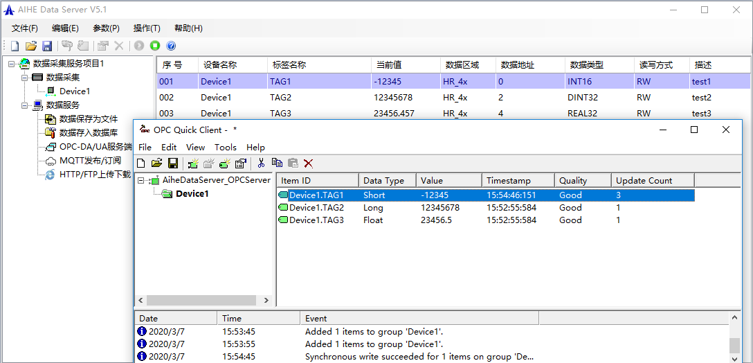 以上5步即完成了ModbusTCP協議的數據采集到數據庫的設置,同時開啟了OPCServer的功能,接下來就是測試了。