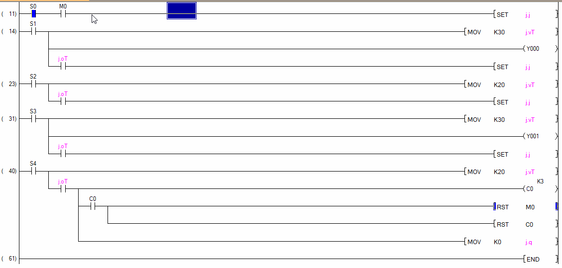 并不是噢,整個(gè)狀態(tài)機(jī)只要給M0置1就可以復(fù)位了,開關(guān)只需要控制M8012的時(shí)鐘就可以了,要重復(fù)觸發(fā)加一條復(fù)位就可以了.