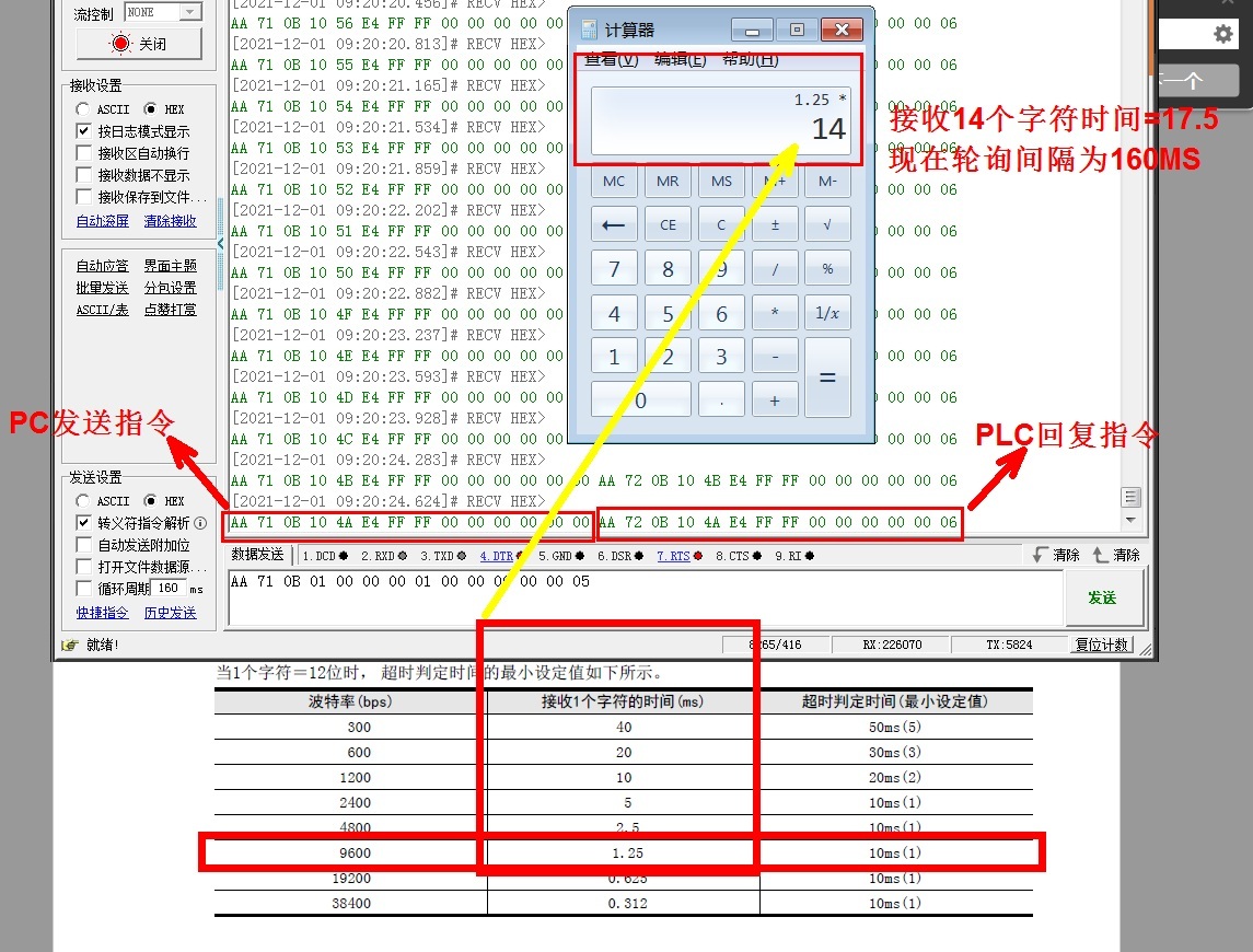 請問如圖所示,PLC發送14個字符時間為17.5MS,那么接收PC14個字符是不是按同理17.5MS計算,可是為什輪詢間隔都設成160MS了為什么PLC還是會偶而沒有回復呢?另外PC做了一個判斷、當收不到PLC的回復時PC就不在輪詢了停在當前狀態。