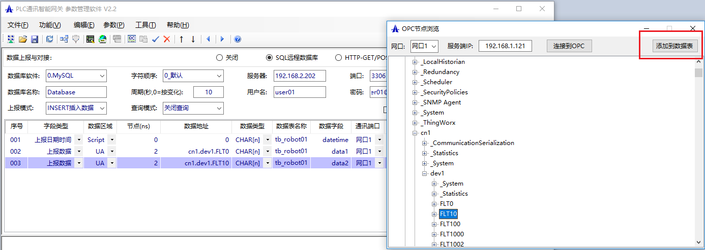 然后通過‘功能’->‘數據上報與對接’設置數據庫服務器的IP地址、端口,用戶名密碼等相關參數。通過‘編輯’->‘OPC節點瀏覽’讓網關模塊連接上OPC服務器后瀏覽標簽節點,選擇需要上報到數據庫的標簽,添加到數據配置表,如下圖: