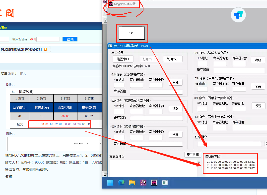 2.從你圖片看,D0要先給數值,7B=123;這串代碼意思是寫入,1站從第0000站起寫,共4個字,CRC系統自動行成;