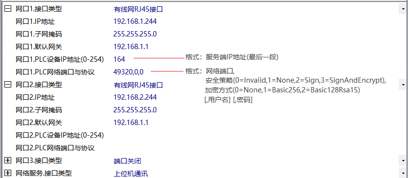 重啟讀取參數(shù)后,確認跟之前所選擇的一致,通過‘功能’->‘網(wǎng)絡(luò)參數(shù)配置表’配置網(wǎng)絡(luò)參數(shù),如下圖 通過IGT-DSER的網(wǎng)口1連接OPCUA的服務(wù)端(opc.tcp://192.168.1.164:49320/),網(wǎng)口2連接S7-200 SMART的PLC(192.168.2.100)。