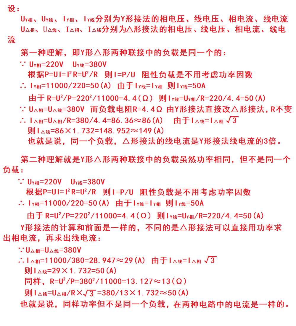 引用引用第14樓老兔子于2024-12-20 16:52發表的 : 對于樓主提出的問題,不同的出題人有不同的意思。 對于初入行或者電工基礎不好的人來說,其意思是星形接法下11kW的阻性負載,直接將其改接為角形聯接接在同樣的三相380V的電源上,電流如何計算?由于出題人是初入門或者電工基礎不好的人,認為星形接法為11kW,那角形接法時仍為11kW,不知道同一負載在不同的電壓下功率也是不同的。 而對于作為教師出作業或者考試題,或者作為競賽題考比賽者的反應能力、判斷能力,看你能不能理解在不同的電壓等級下同一功率的負載,其電阻(或電流)大小也不會相同。作為教師出作業或者考試題來說,這道題沒有明確指出兩種電路中的負載是否是同一個,等于設下一個“坑”。.......