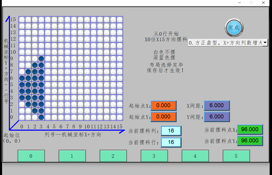 這只是一個計算方法。應用中,根據按行或按列,自動程序里擺好一個點后列號加1或行號加1,這個方法計算下個點的坐標和判定擺盤是否完成,像你這個圖里就是擺盤完成了。