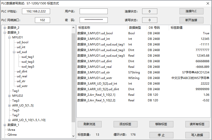 這個應該是用西門子的S7 PLUS協議,支持標簽方式讀寫PLC數據,能瀏覽到PLC中所有標簽、塊以及結構體的信息,如下圖,