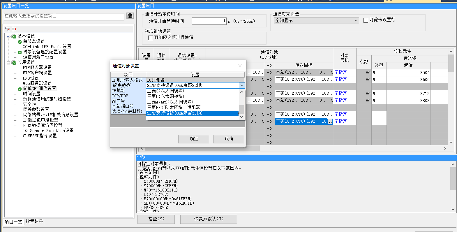 如圖是FX5U的簡單cpu通信設置,可以看到設備類型除了三菱自家的plc,還可以選西門子等第三方的plc,用這個通信很方便都不用寫程序。