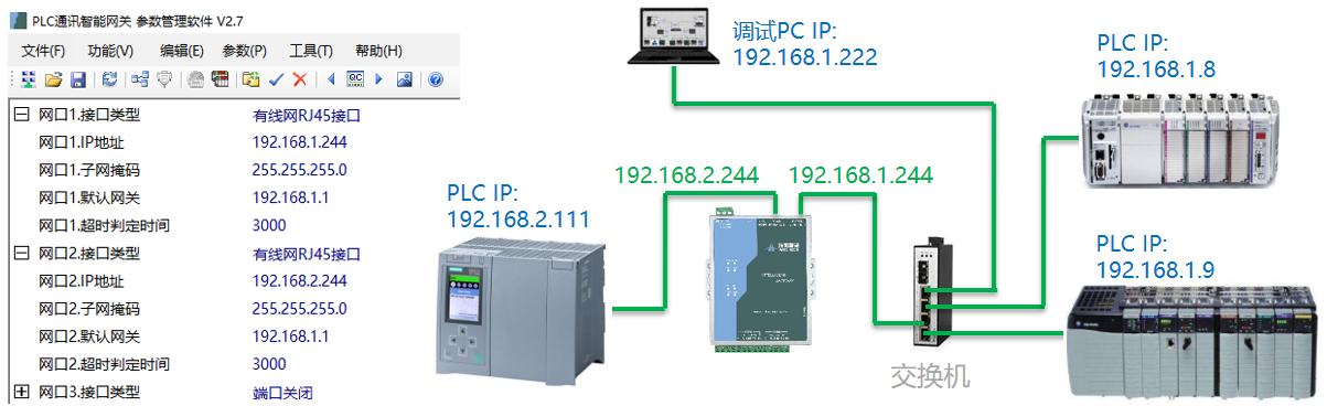 二、跨網段的PLC之間通訊: IGT-DSER智能網關的兩個網口設置為不同的網段,每個網口是獨立的不同網段的子網。