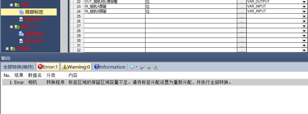 解決方法:工具-自動分配軟元件設(shè)置,分配更多的軟元件給自動分配區(qū)(注意自動分配的區(qū)間編程時不要人工調(diào)用或使用,也不要與斷電保持區(qū)間之類的重復(fù))。或減少FB所使用的標(biāo)簽。