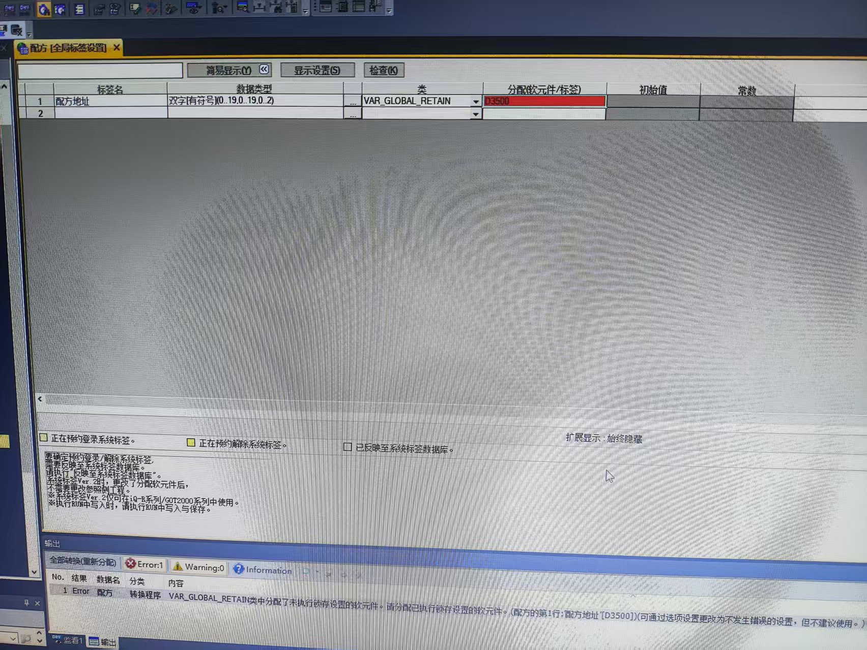 你的變量類型里的RETAIN是斷電保持的變量,而你D3500不是斷電保持的寄存器,把寄存器換成斷電保持的就行