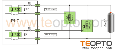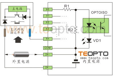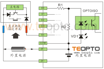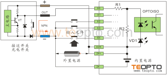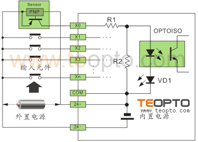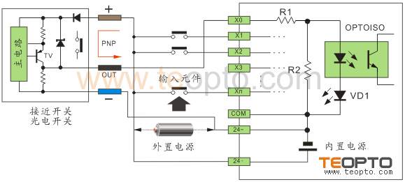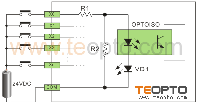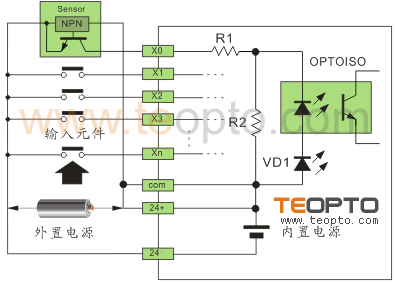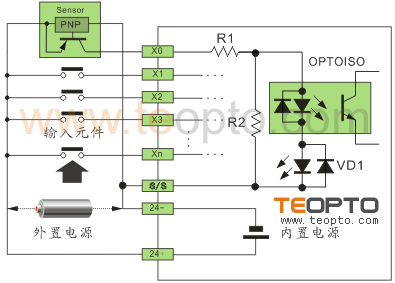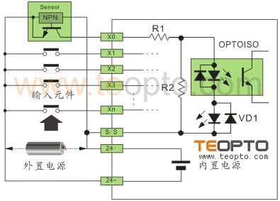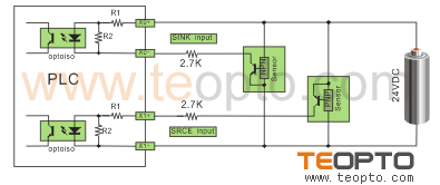 以NPN改為PNP為例,將24V+串電阻后與NPN信號相并聯接到輸入點上,則可以達到PNP的效果。