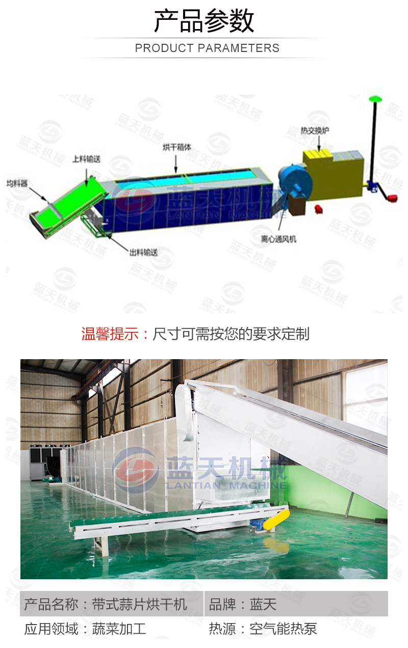 帶式蒜片烘干機由烘干箱體、熱泵主機、輸送裝置、均料裝置、密封裝置、保溫裝置、熱風輸入裝置、電控溫控裝置組成。