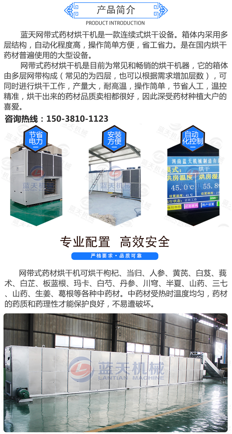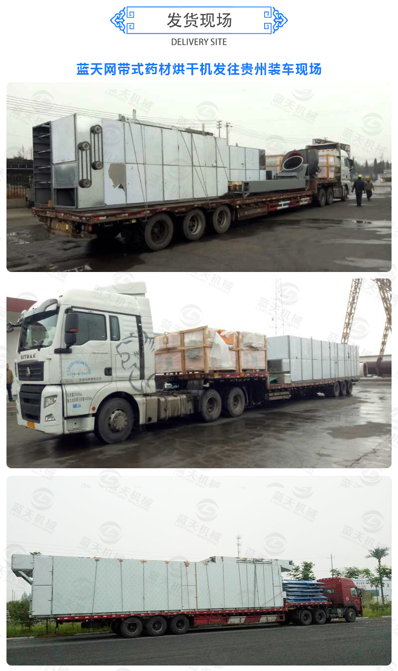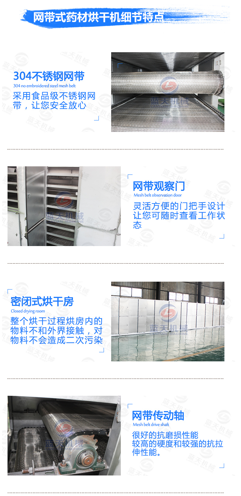 4、網(wǎng)帶式藥材烘干機采用分體設(shè)計,烘干箱采用的是不銹鋼材料,耐高溫,腐蝕。