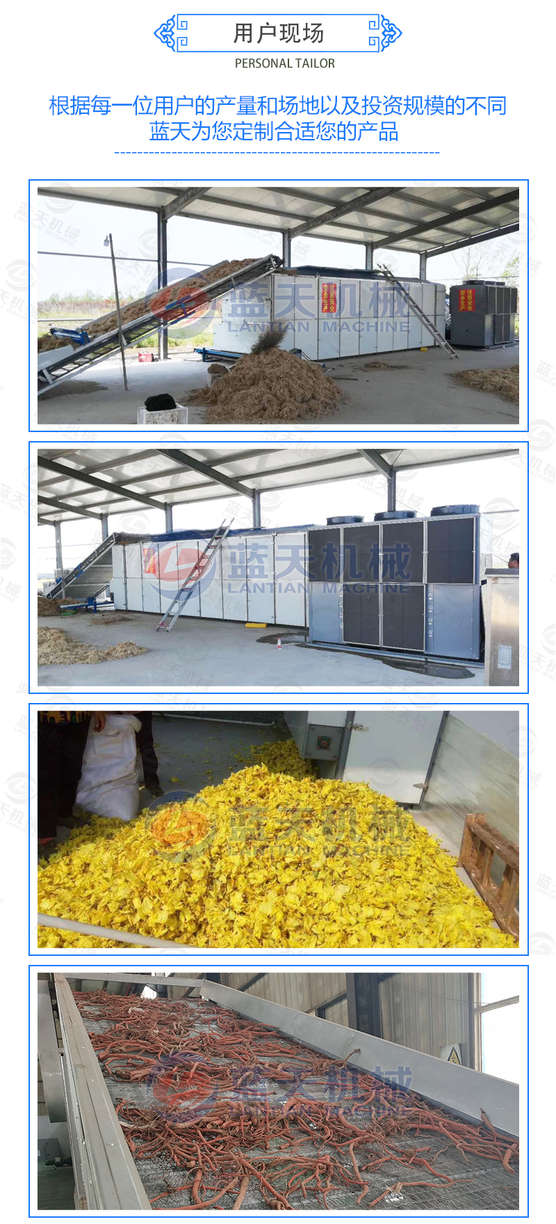 2、大型藥材烘干設(shè)備的熱泵主機與多層烘干箱分開,進入烘干機內(nèi)的是純凈的熱風(fēng),沒有污染,更不會出現(xiàn)火災(zāi)隱患。