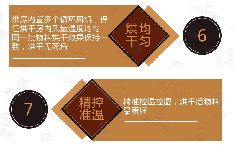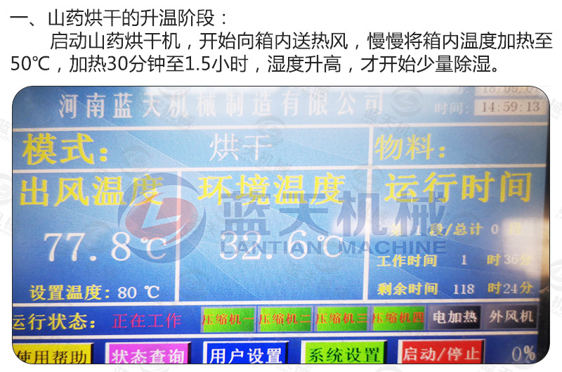 4、小切片烘干時,山藥烘干機的溫度不能太高,一般控制為70-90℃,時間設置為6-7個小時。大切片烘干時,山藥烘干設備的溫度設置要高點,一般控制在80-100℃,烘干時間為9個小時。碎切片烘干則溫度要求較低,烘干時間為5個小時,溫度設置為60-80℃。
