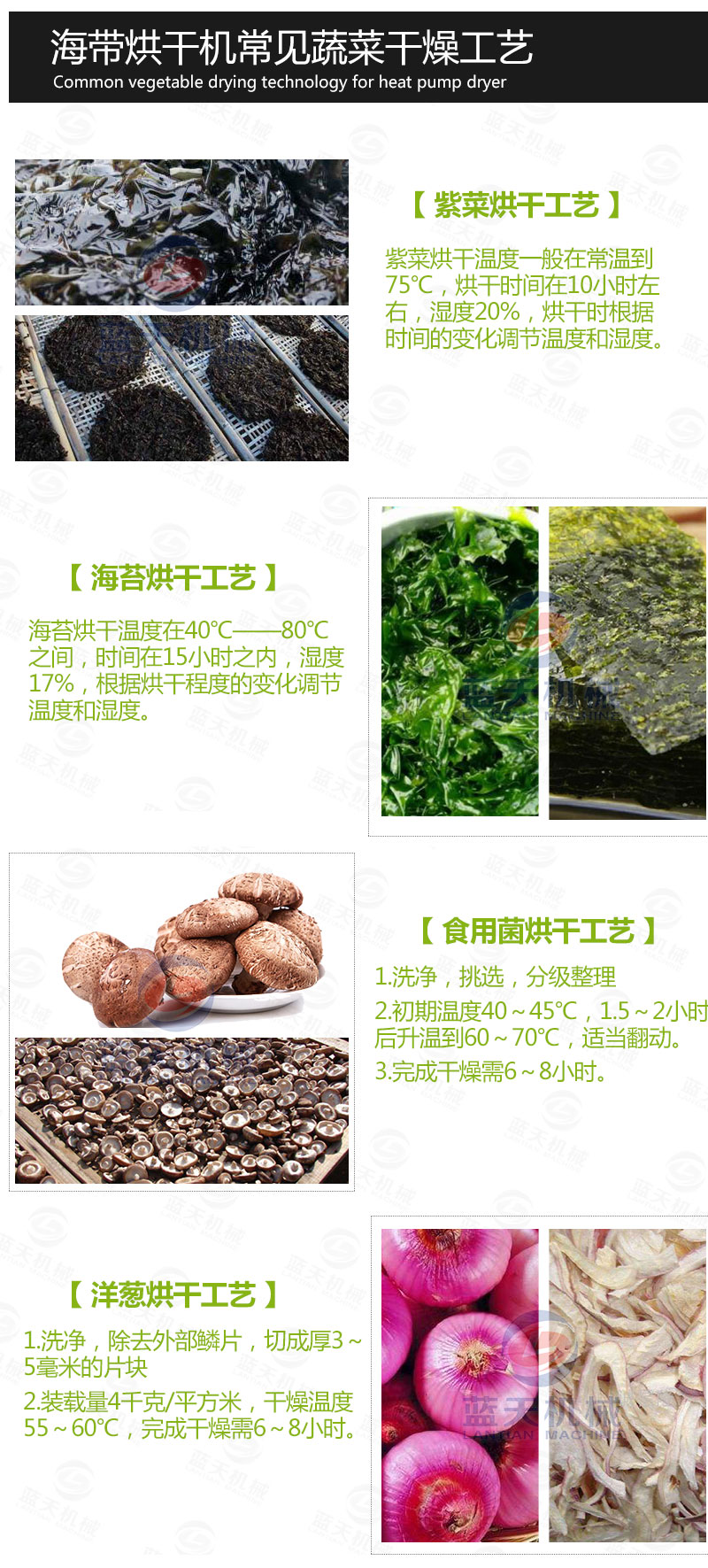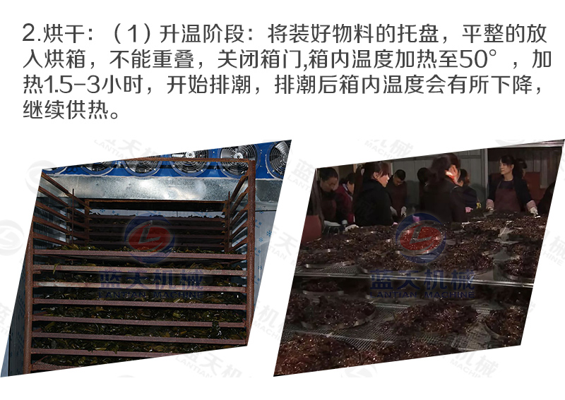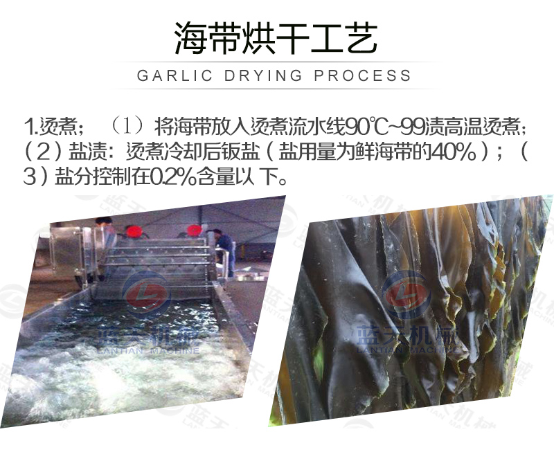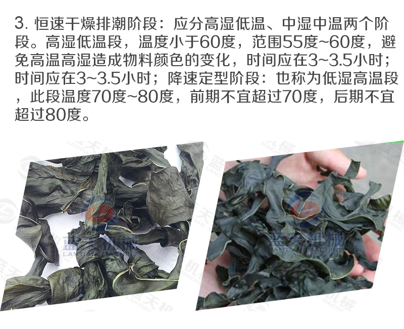 1、溫度—海帶的烘干一般要求比較低的溫度下進行,以避免高溫影響產品烘干后的質量。